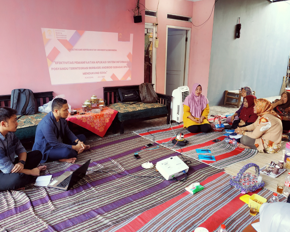 The FoN UI Community Service Team consists of three lecturers, namely Ns. La Ode Abdul Rahman, S.Kep., MBA; Dr. Hanny Handiyani, S.Kp., M.Kep.; Ns. Shanti Farida Rachmi, S.Kep., Sp.Kep.MB; and four students, namely Ns. Friska, S.Kep.; Ns. Vergeina Ayu, S.Kep.; Muhammad Aziz; and Fakhri Muhammad Rizaldi S.Kep. To maximize the use of SIMADU, the FIK UI Community Service team held a socialization on (12/7) at the home of the head of the Flamboyan Posyandu, Kukusan, Depok. The material presented in this activity includes topics related to the Posyandu information system, SDGs, SIMADU applications, mentoring and evaluation of the Posyandu information system program. Knowing the various features and conveniences of this system, the cadres who participated in the socialization of this program seemed very enthusiastic and impatient to implement SIMADU in their respective posyandu.