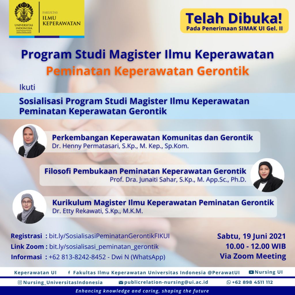 Fakultas Ilmu Keperawatan Universitas Indonesia (FIK UI) membuka Peminatan Gerontik di Program Studi Magister Ilmu Keperawatan. Program studi tersebut membuka pendaftaran penerimaan mahasiswa baru untuk Peminatan Keperawatan Gerontik pada SIMAK UI Gelombang ke-2 pada 7 Juni – 9 Juli 2021. Calon mahasiswa dapat mendaftar pada halaman penerimaan.ui.ac.id. Untuk memperkenalkan Peminatan Gerontik kepada masyarakat, FIK UI […]