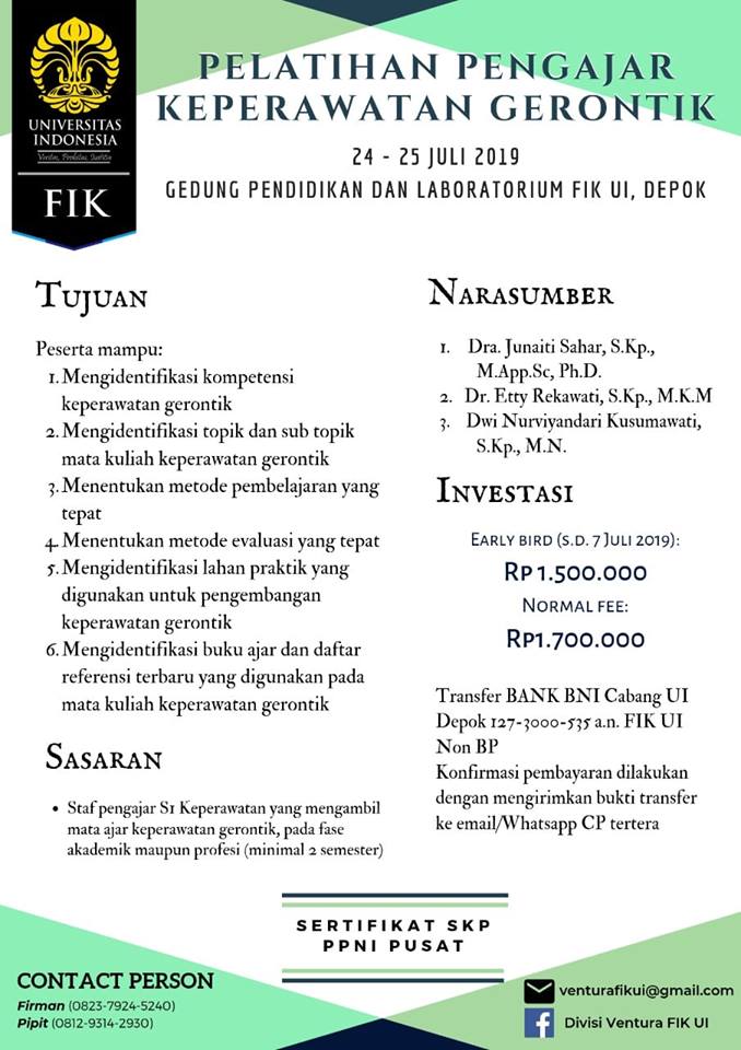 Salam sejahtera, Bapak dan Ibu Perawat Kebanggaan Indonesia! Kali ini FIK UI mengadakan Pelatihan Pengajar Keperawatan Gerontik yang akan diadakan pada tanggal 24 – 25 Juli 2019 di Gedung Penelitian dan Laboratorium FIK UI Depok. Yuk kembangkan lagi ilmu tentang keperawatan gerontik bersama para ahlinya dari FIK UI. Come and join us! Segera kontak CP […]