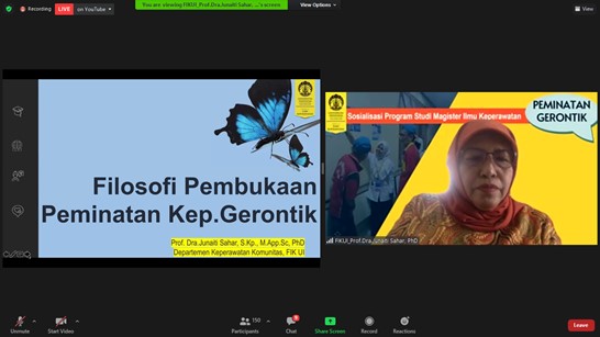 Untuk memperkenalkan Peminatan Gerontik kepada masyarakat, FIK UI menyelenggarakan “Sosialisasi Pembukaan Program Studi (prodi) Magister Ilmu Keperawatan Peminatan Gerontik” yang dilaksanakan secara daring melalui zoom, dan dihadiri lebih dari 160 peserta pada Sabtu lalu (19/6). Dekan FIK UI, Agus Setiawan, S.Kp., M.N., D.N, hadir membuka acara tersebut dan mengatakan bahwa, “Pembukaan peminatan Keperawatan Gerontik ini merupakan salah satu jawaban dari komitmen FIK UI yang terus berjalan secara dinamis dan tantangan dari perkembangan ilmu pengetahuan.”